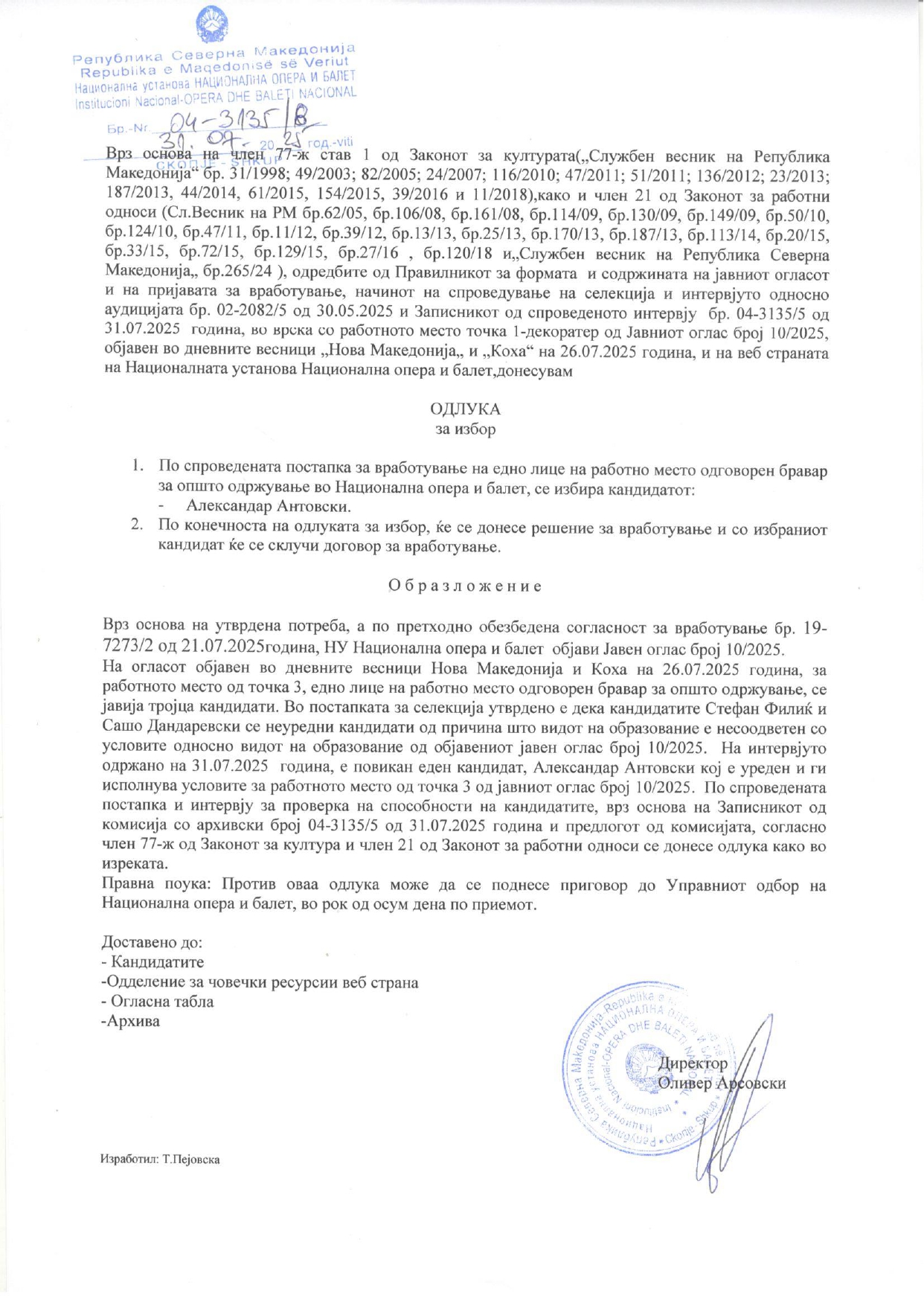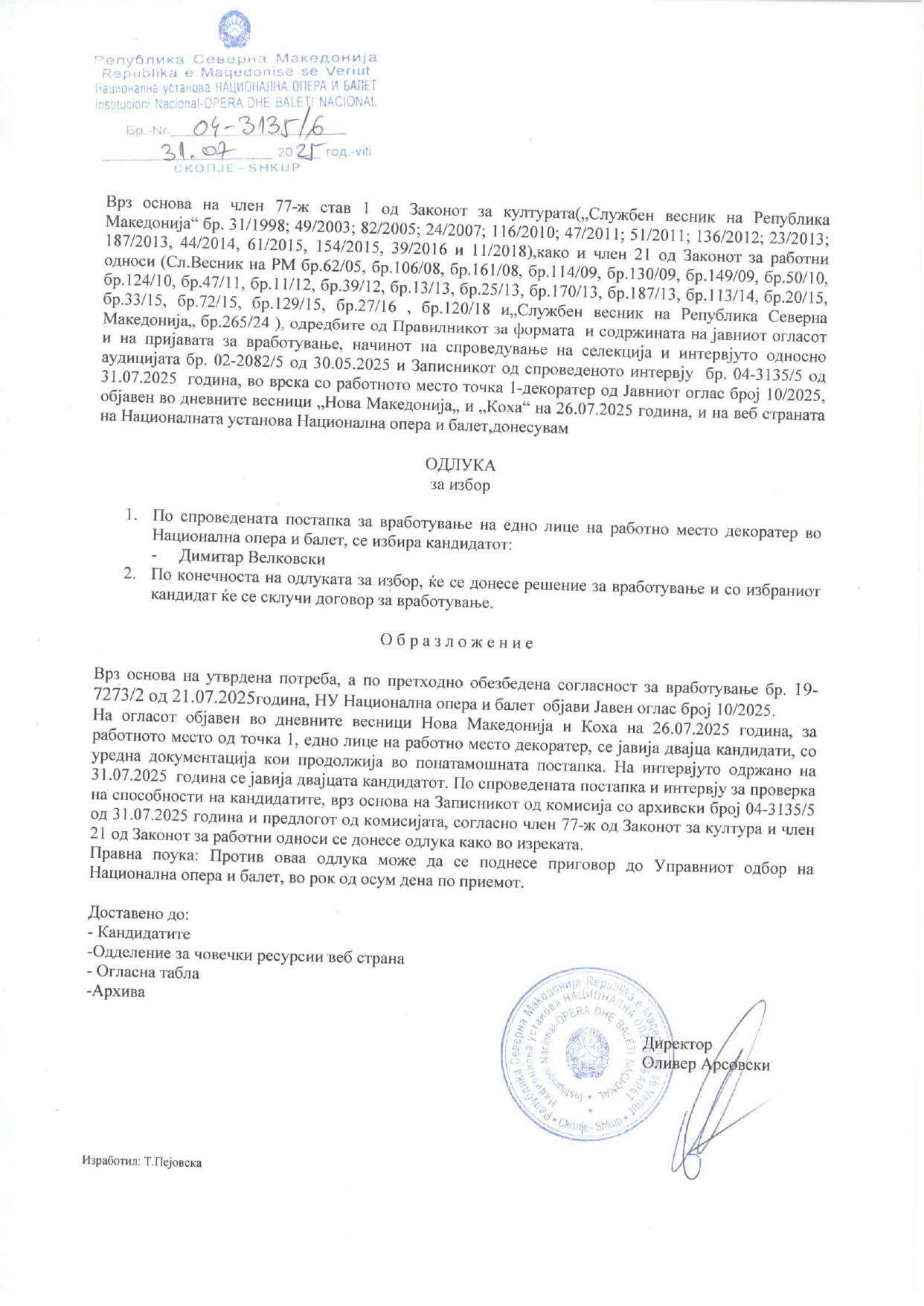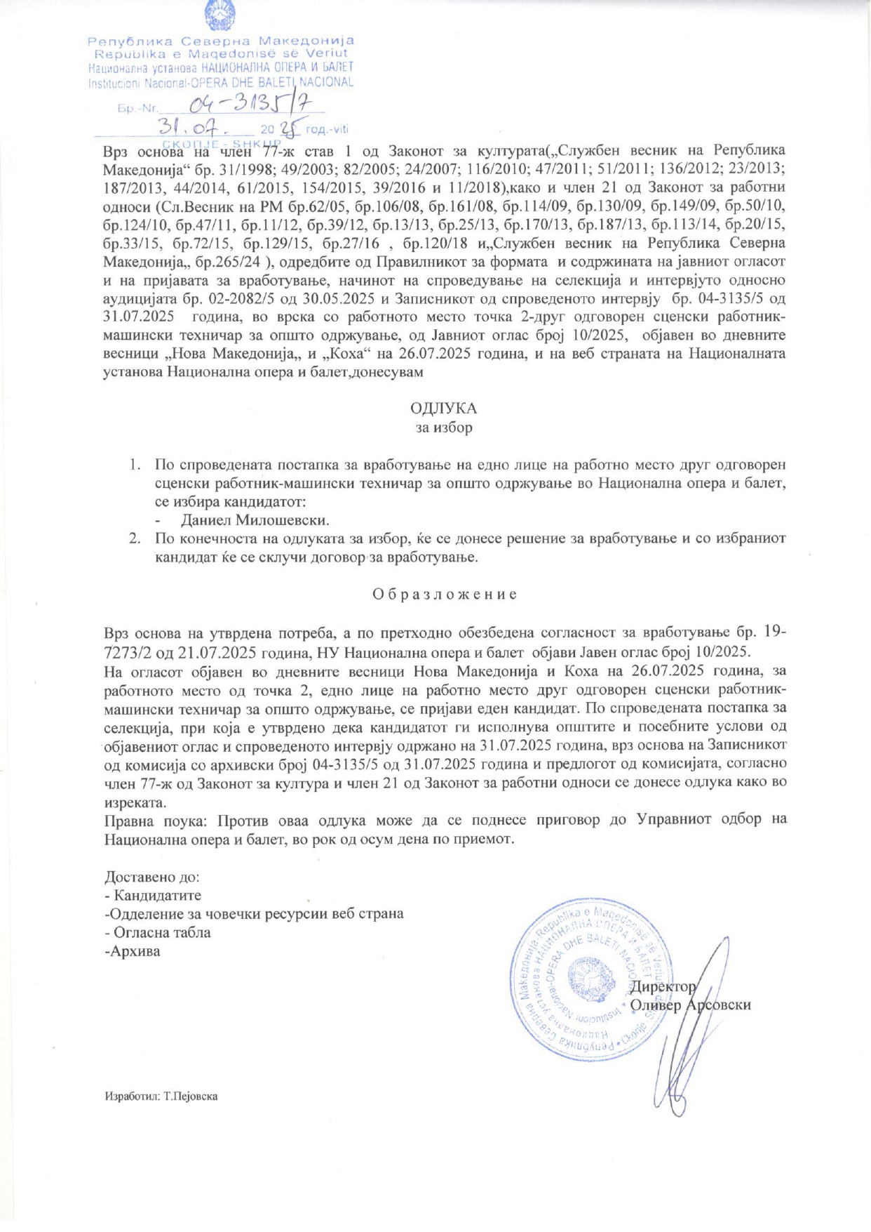 одлука за избор по јавен oглас 10/2025