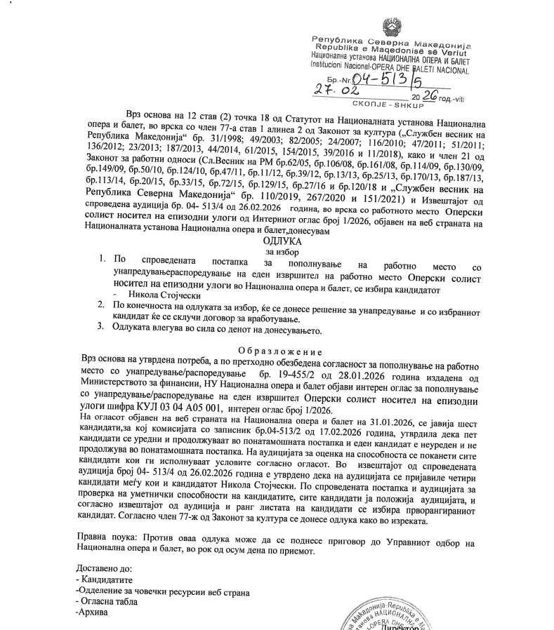 Одлука од Интерен оглас бр.1/2026 – Оперски солист носител на епизодни улоги